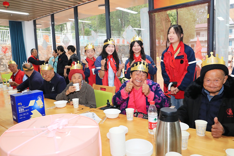 石埠鎮(zhèn)敬老院窗明幾凈,2023年整體改造提升后基礎(chǔ)設(shè)施精良。老人們圍桌而坐,孩子們敬上菊花茶,同老人們一起分享蛋糕,和節(jié)日的喜悅。