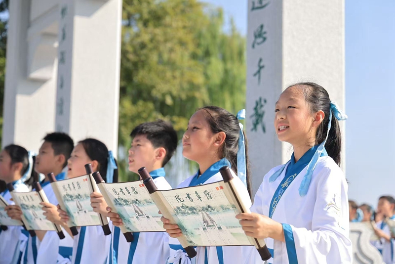 上午9時21分,豫章書院牌坊下,百余名身著月白色傳統(tǒng)漢服的“孺子小書童”們手持書卷,齊誦《豫章書院學(xué)約十則》《論語》節(jié)選及《橫渠四句》?!盀樘斓亓⑿?,為生民立命……”的清脆童聲,與旁側(cè)悠揚古韻交織,久久回蕩在飛檐斗拱間。